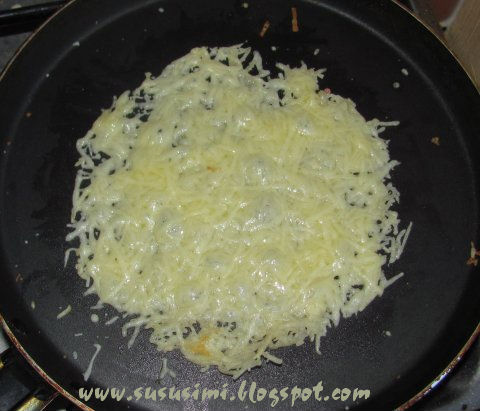 Liek uz sausas pannas plānā kārtiņā un cep,kamēr siers izkusis un ir izveidojusies viegli brūna garoziņa.
